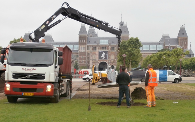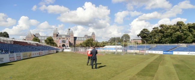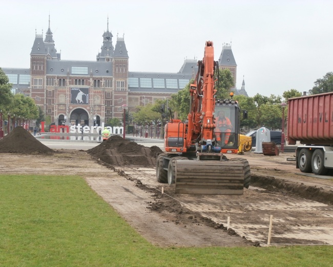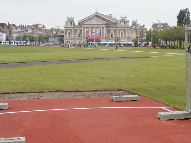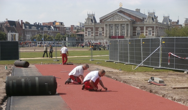 Discus- en speerwerpen op het Museumplein: je laat een graafmachine komen graaft een gat in het Museumplein. Opvullen met funderingsmateriaal en 's avonds asfalt aanbrengen. Na een nacht afkoelen wordt de prefab kunststoflaag aangebracht. Aan het einde van de middag de IAAF keuring en na 2 dagen is het Museumplein een internationale speerwerpvoorziening. Zo doe je dat!