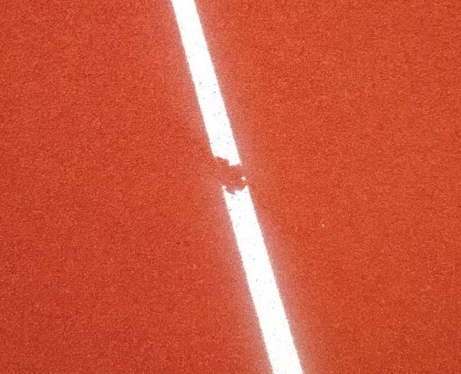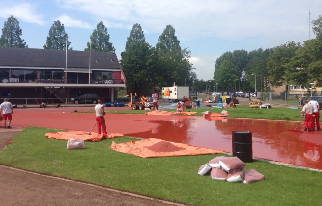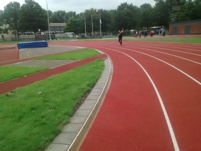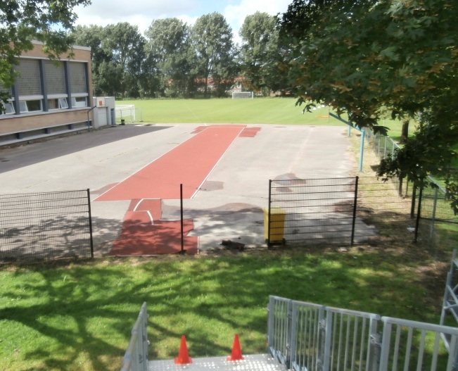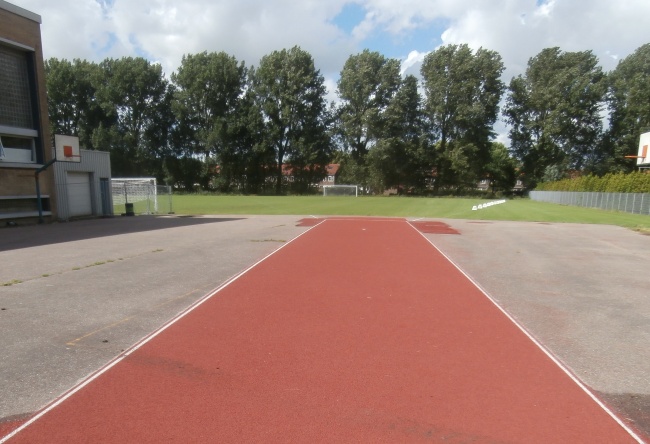 De tijdelijke aanloop voor het speerwerpen op een bestaand asfaltveldje.