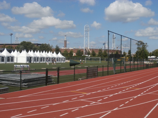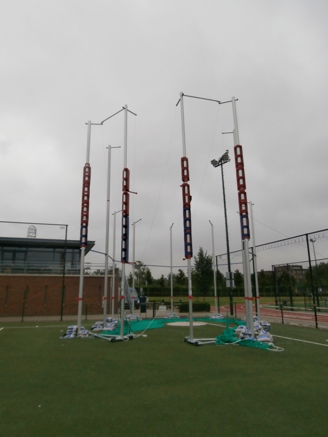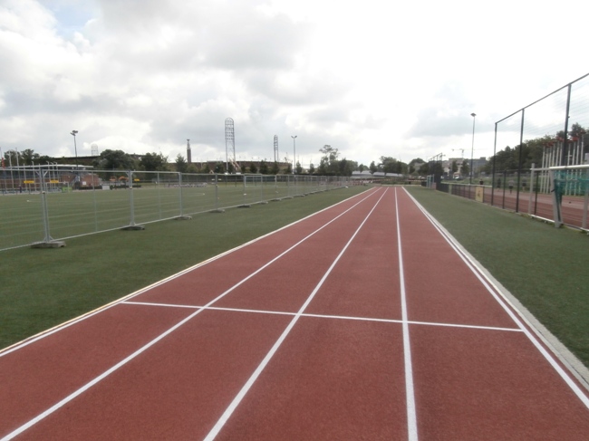Tijdelijke aanloop voor het speerwerpen langs de kantine van Arsenal naar kunstgrasveld 2.