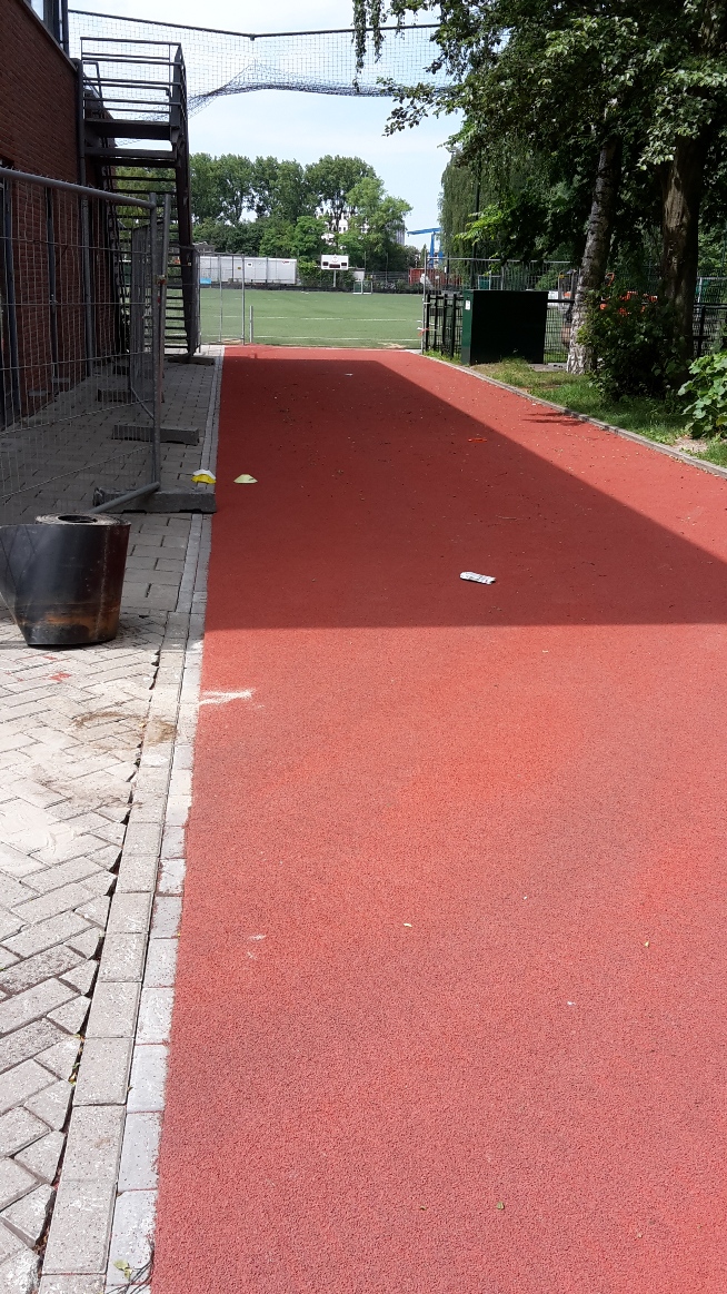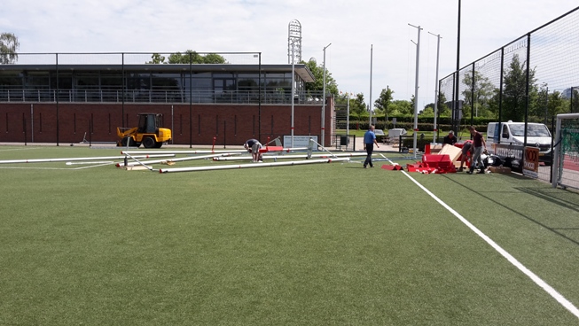 De aanleg van 4 tijdelijke sprintbanen in kunstgrasveld 1.